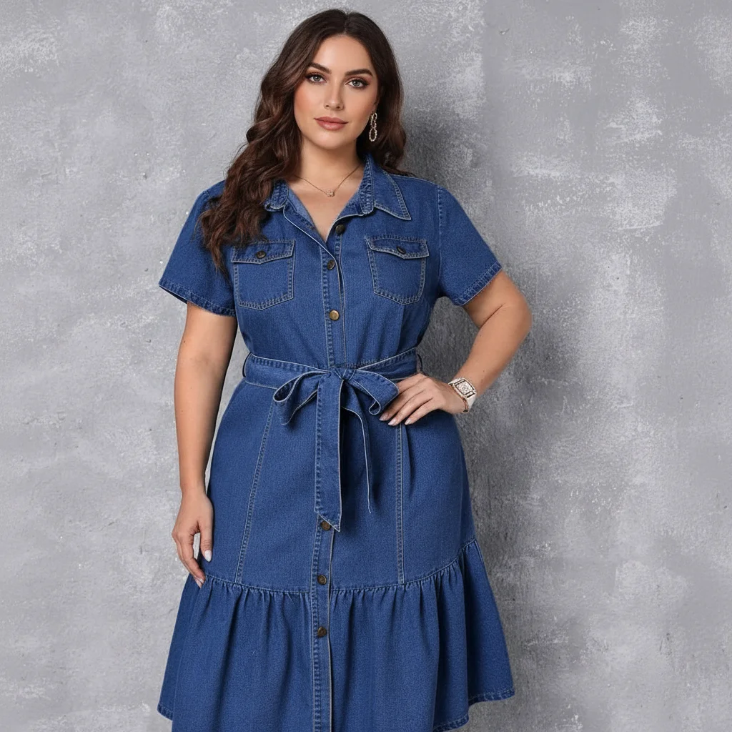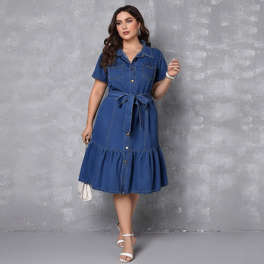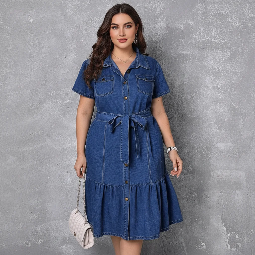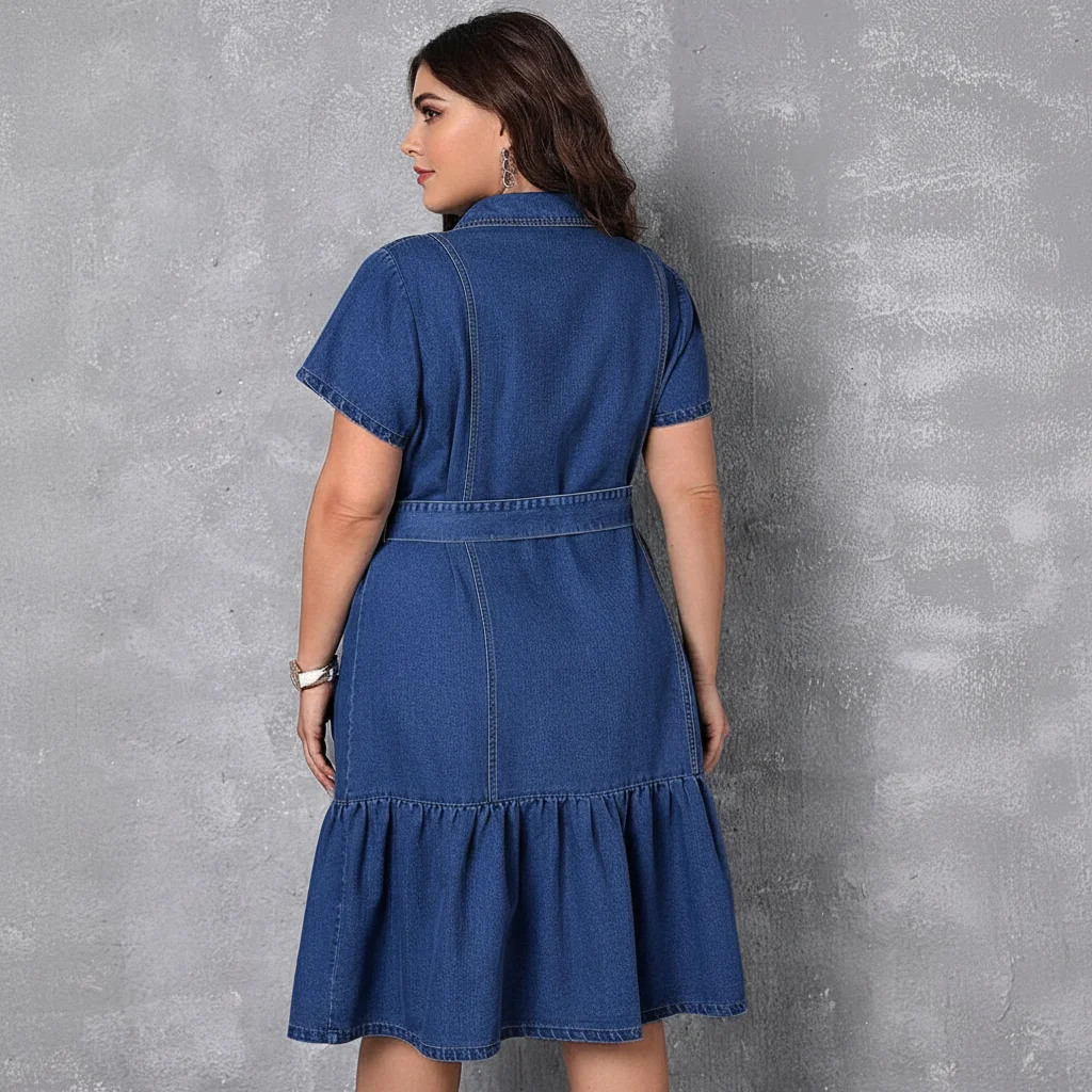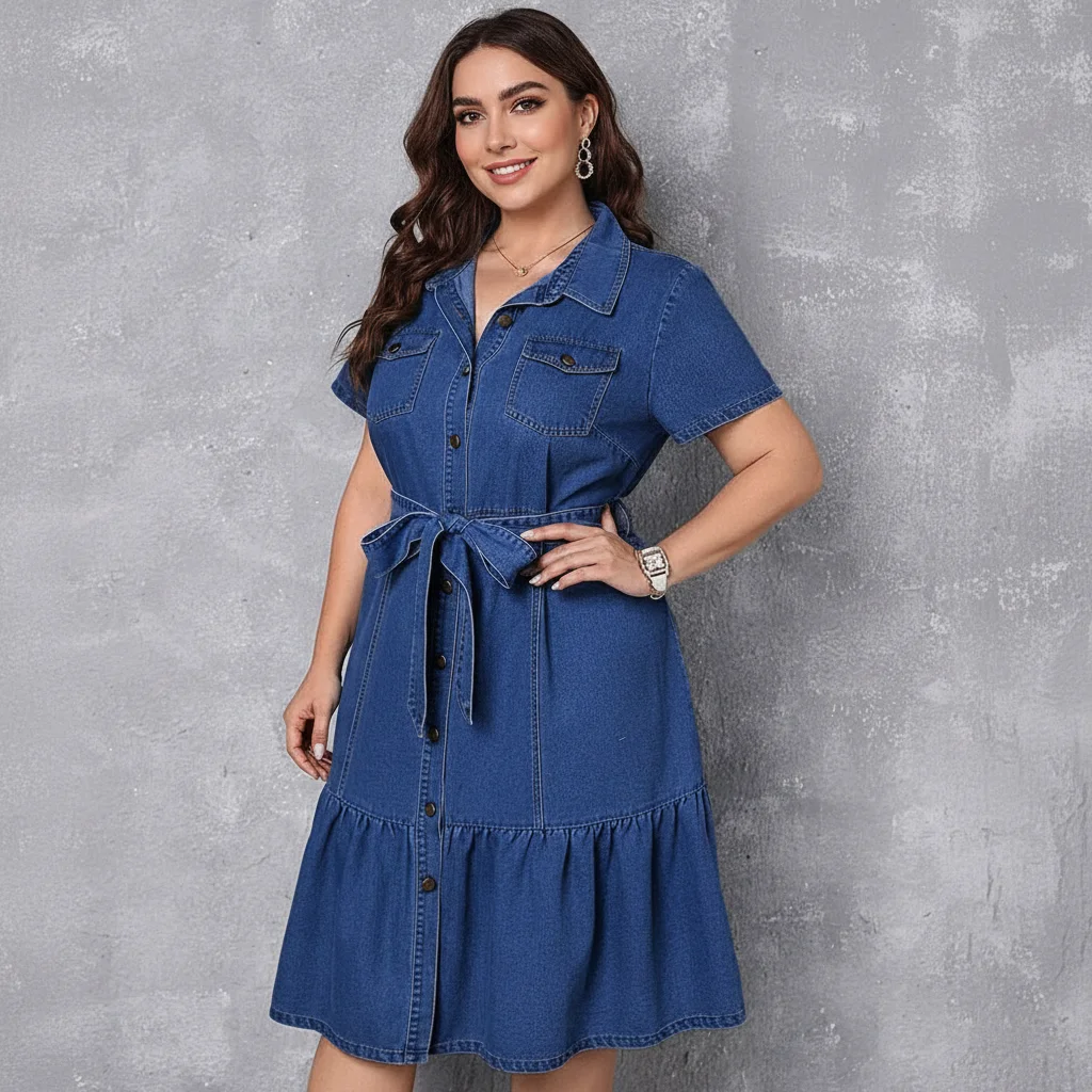 Woven denim dress (270–320 GSM) with shirt collar, short sleeves, button placket, detachable tie belt, chest pockets, and a tiered skirt for movement.