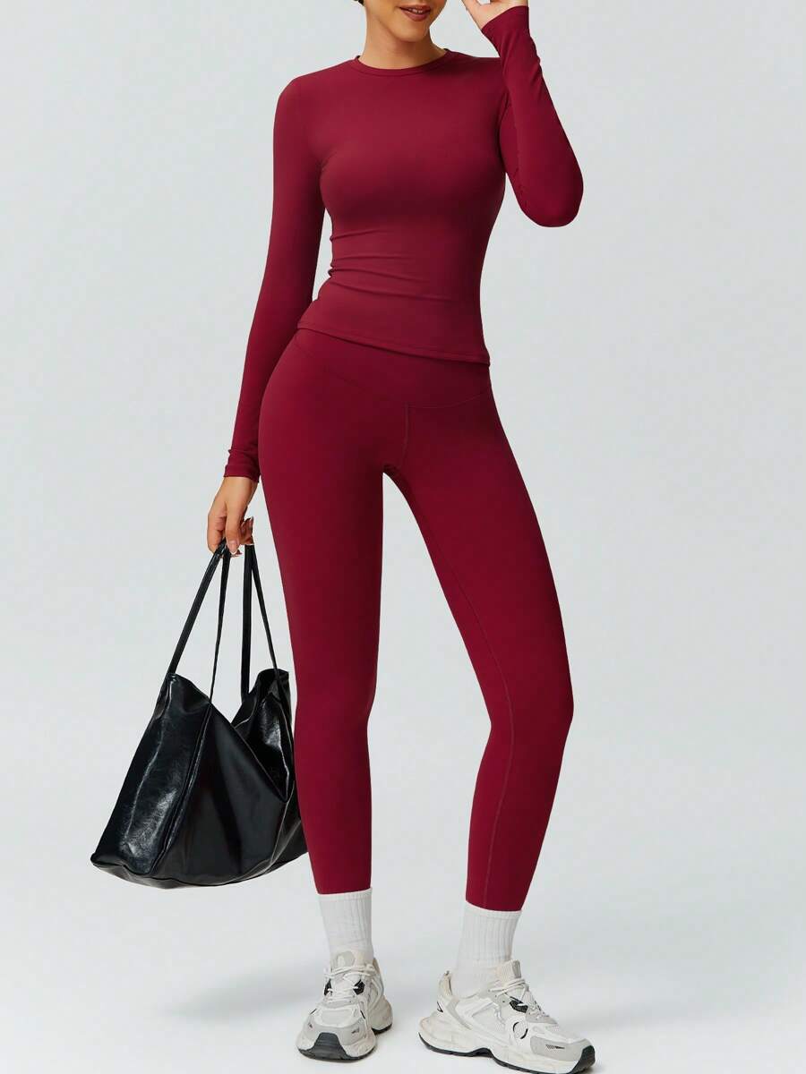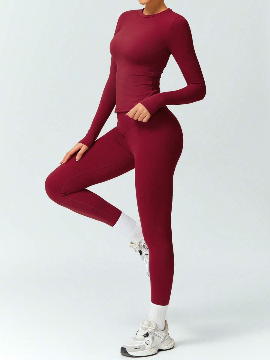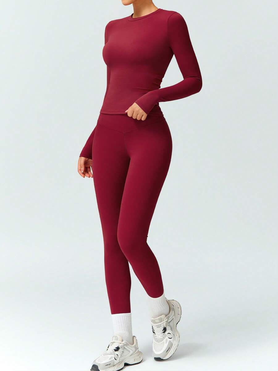 Women’s Solid Color Casual Sports Top And Pants Set, Suitable For Daily Yoga And Workout
